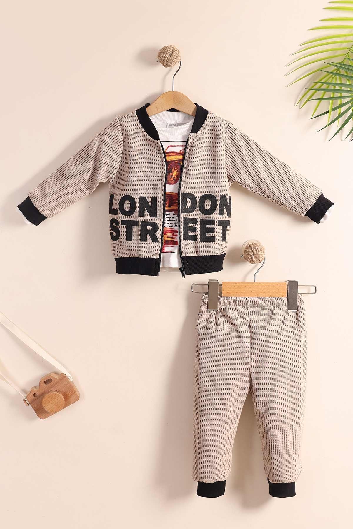 Bu şık takım, dış giyimde kullanılabilecek, üzerinde "London Street" yazısı bulunan bej fermuarlı hırka (ceket), içinde sevimli araba baskısı olan uzun kollu beyaz sweatshirt ve kombinasyonu tamamlayan bej alttan oluşur. Ürünün tamamı %100 pamuklu yumuşak kumaştan üretilmiştir, bu sayede bebeğinizin hassas cildine en nazik dokunuşu sunar.