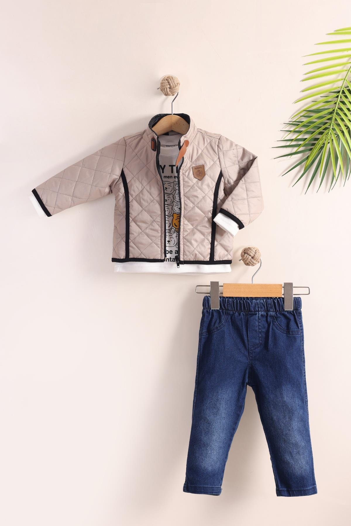 Bebeğinizin sonbahar ve kış şıklığını tamamlayacak, modern ve havalı bu bej 3'lü takım ile tanışın! Montu, sweatshirt'ü ve kot pantolonu ile bebeğinizi soğuktan korurken, tarzından ödün vermeyecek.