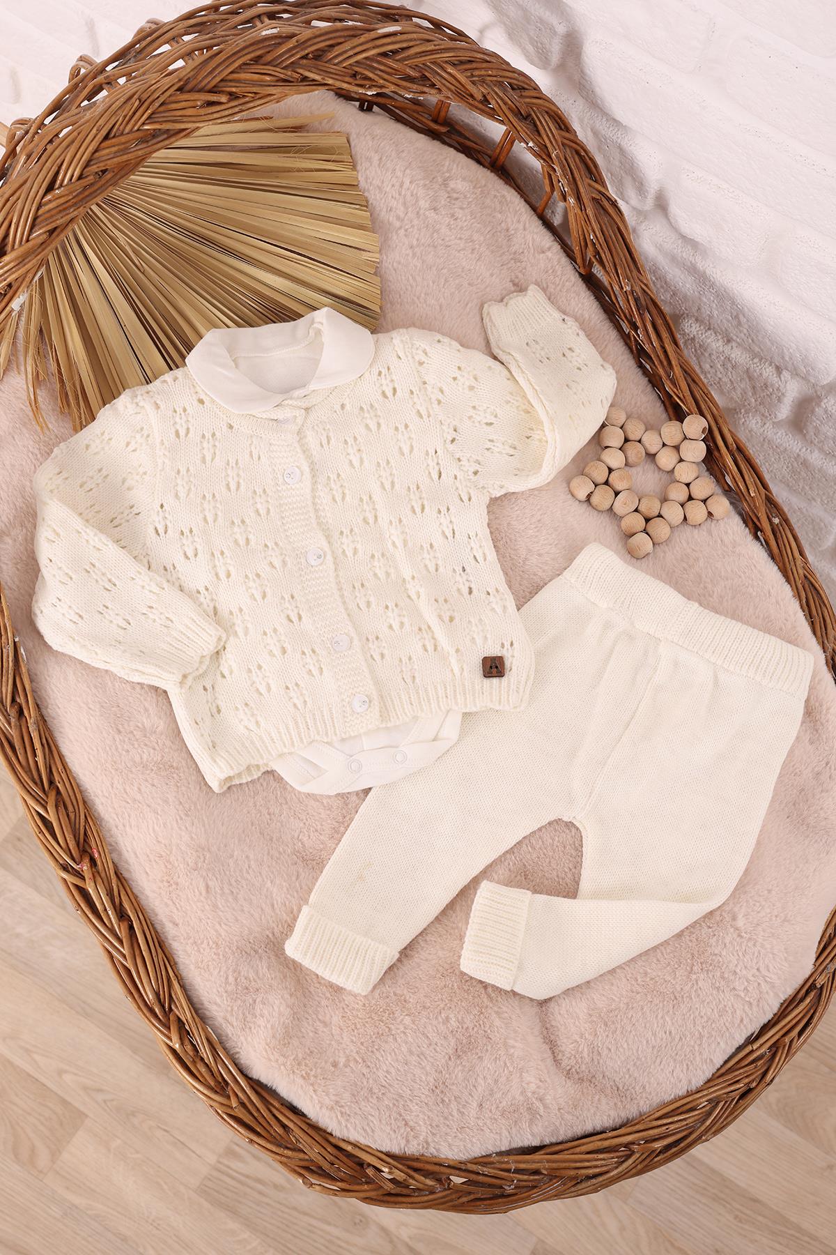Bu takım, farklı kombinasyonlar oluşturabileceğiniz üç ana parçadan oluşur. Örme ekru üst ve uyumlu ekru alt ile bebeğinizin günlük şıklığı garantilenirken, takımın içindeki sade ve kullanışlı beyaz body (zıbın), ekstra bir katman olarak hem rahatlık hem de sıcaklık sağlar. Tüm parçalar pamuklu içeriğe sahip olduğu için bebeğinizin cildini tahriş etmez ve gün boyu rahat etmesini sağlar. Bu şık ve fonksiyonel takım, 3-6, 6-9 ve 9-12 ay beden seçenekleriyle bebeğinizin büyüyen ihtiyaçlarına uyum sağlar.