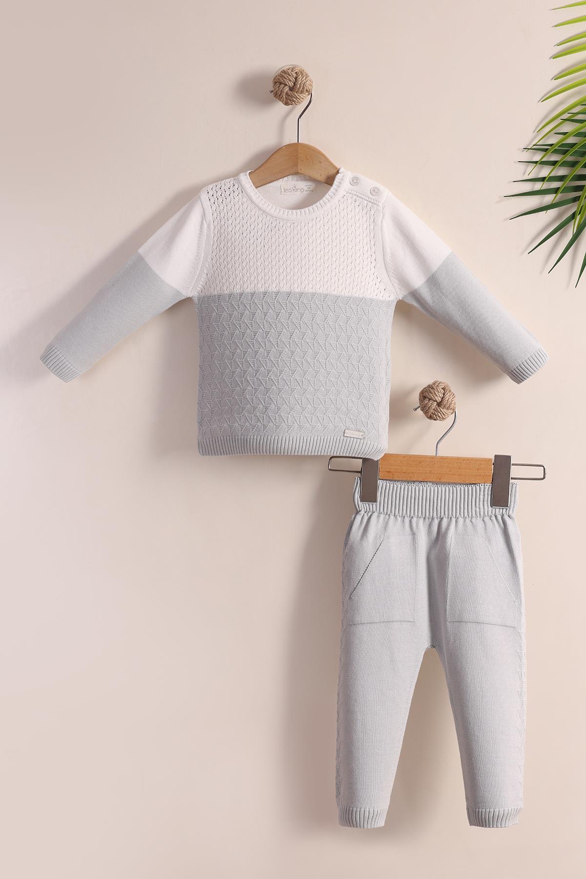 Bu takım, günlük kullanımda ve özel anlarda rahatlıkla tercih edebileceğiniz iki temel parçadan oluşur: gri-beyaz uzun kollu üst ve uyumlu gri alt. İki parça da %100 pamuklu kumaşı sayesinde bebeğinizin cildini tahriş etmeden, gün boyu rahat etmesini sağlar. Kış ve sonbahar aylarının soğuklarına karşı koruma sağlayan bu premium takım, 6-9, 9-12 ve 12-18 ay beden seçenekleriyle bebeğinizin büyüyen ihtiyaçlarına uyum sağlar.