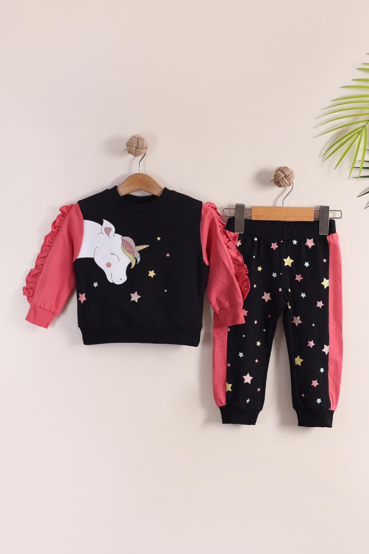 Gül kurusu zemin üzerine unicorn ve yıldız baskılı, pembe detaylı kız çocuk takımı
