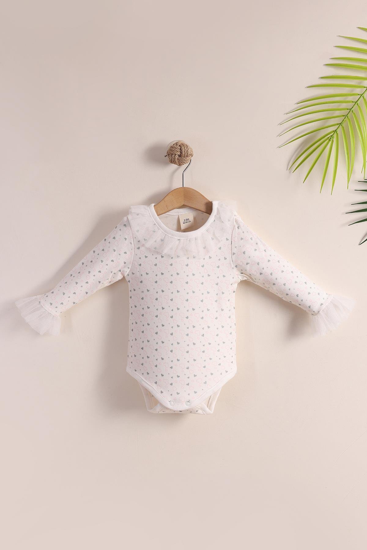 Ekru zemin üzerinde kalpli, dantel detaylı uzun kollu kız bebek zıbını