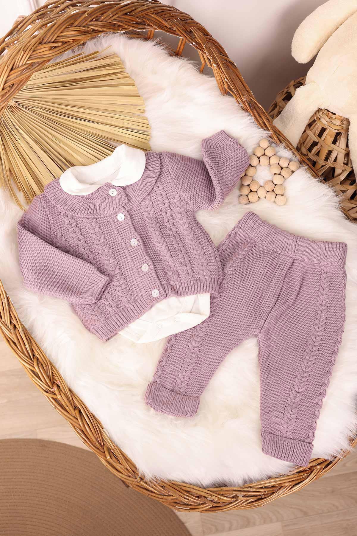 Bebeğinizin kış ve sonbahar aylarında hem şık hem de sıcacık kalması için tasarlanan bu lila 3'lü triko takım, şıklığı ve konforu bir araya getiriyor. Yumuşak pamuklu kumaşı ve modern triko örgüsüyle, bebeğinizin hassas cildine dost bir dokunuş sağlar.