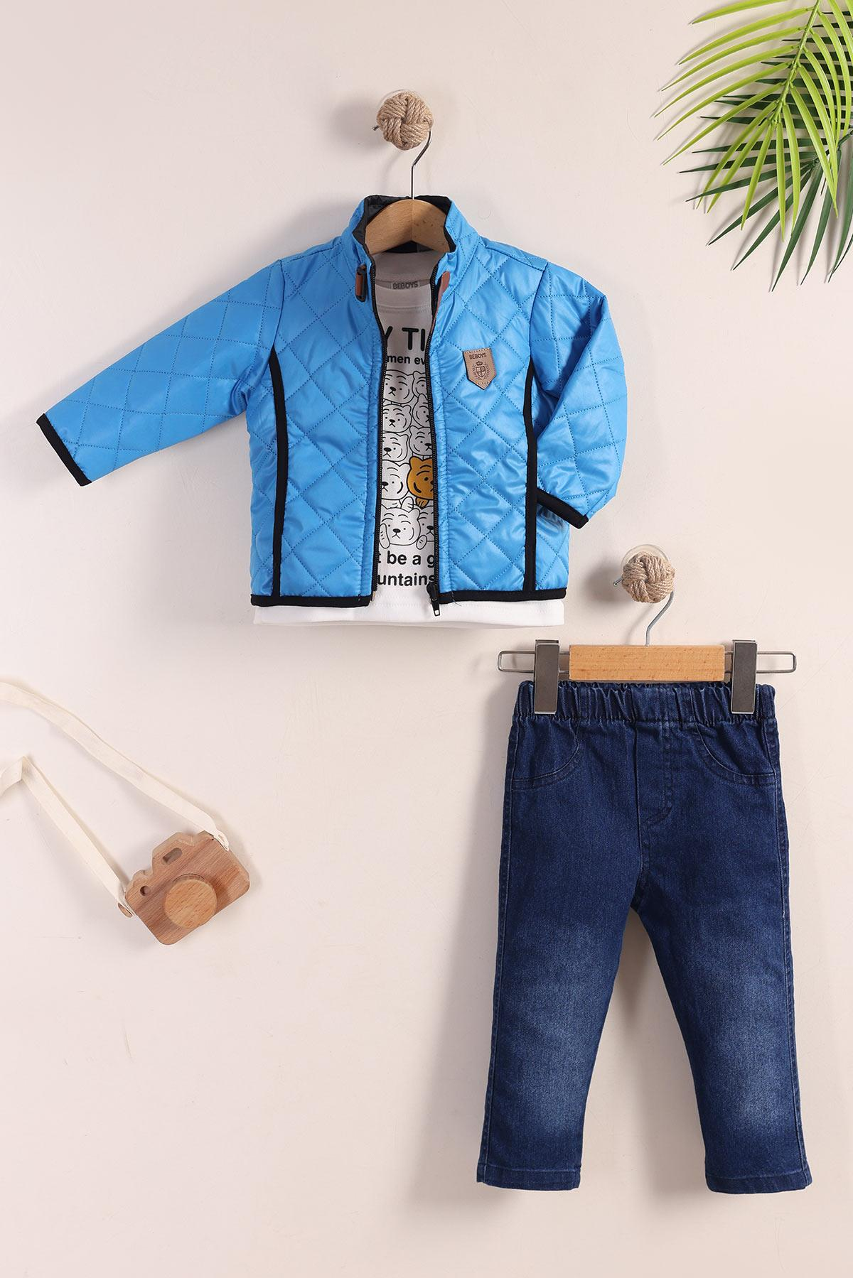 Mavi mont, sweatshirt ve kot pantolondan oluşan 3'lü erkek bebek takımı