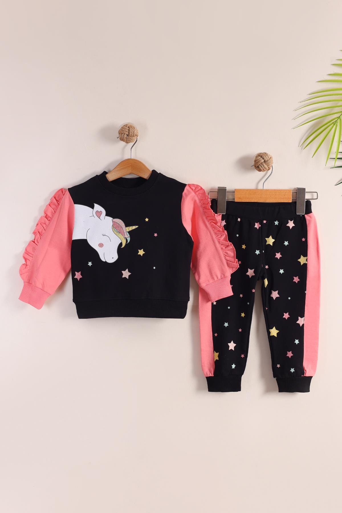 Mercan zemin üzerine unicorn ve yıldız baskılı, pembe detaylı kız çocuk takımı