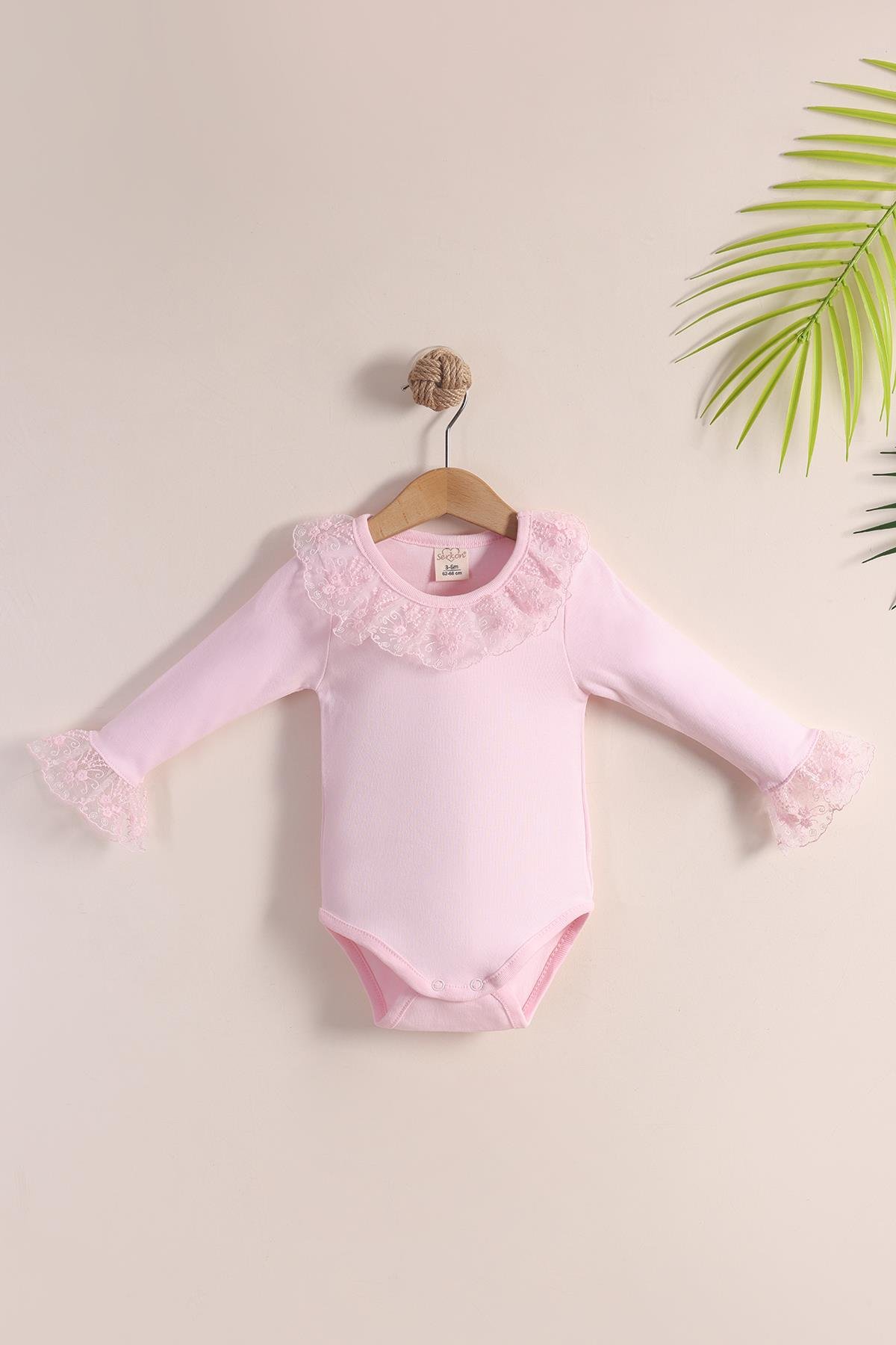 Pembe, dantel detaylı uzun kollu kız bebek zıbını