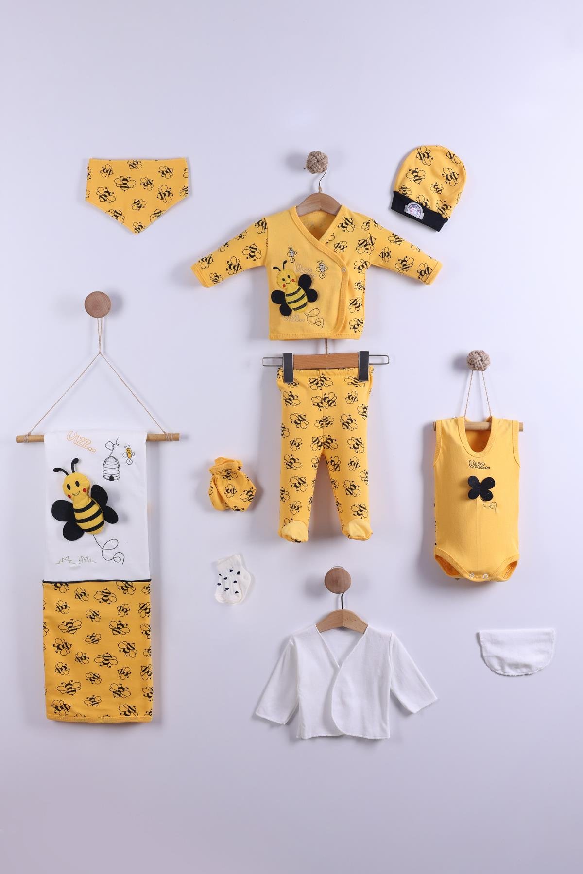 Neşeli arı motifleriyle süslenmiş bu sarı lüks 10’lu bebek seti, yenidoğanlar için eksiksiz bir başlangıç sunar. %100 pamuklu kumaşıyla bebeğinizin hassas cildiyle tam uyum sağlayarak maksimum konfor sunar. Günlük kullanım için ideal olan bu set, aynı zamanda doğum hediyesi olarak da tercih edilebilir.