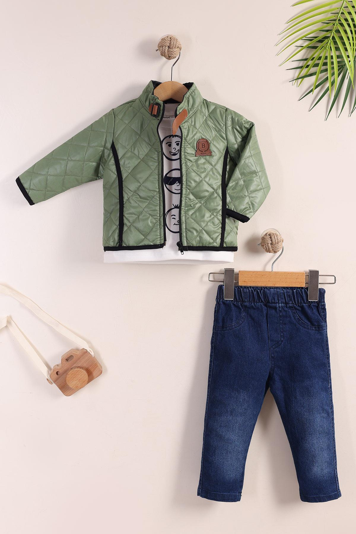 Yeşil mont, sweatshirt ve kot pantolondan oluşan 3'lü erkek bebek takımı